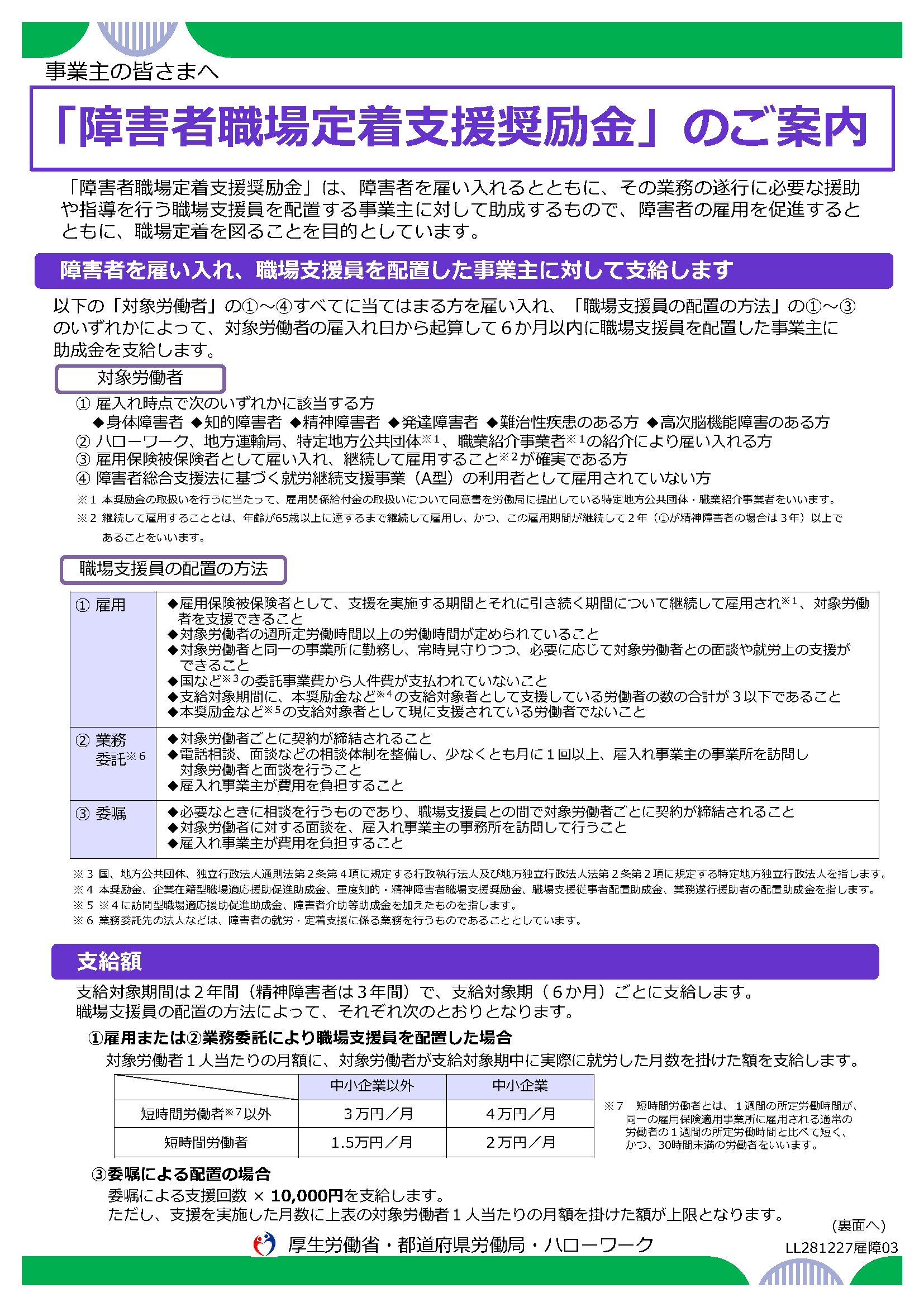今年度より「障害者職場定着支援奨励金」が創設されています。障害者を雇用し、職場支援員を配置した事業主に対して助成金が支給される制度です。「業務委託」という配置形態の場合、雇い入れた労働者毎に、企業と就労支援に関わる法人とで契約を結びます。